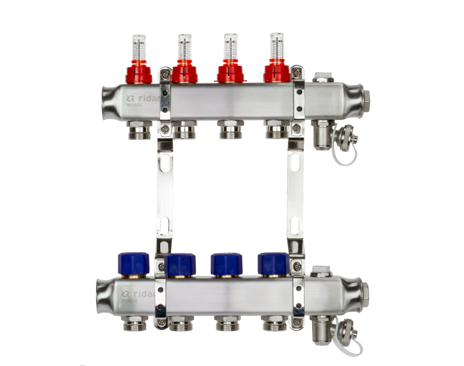 Коллекторные группы с расходомерами, кронштейнами, ручным воздухоотводчиком, сливным краном и торцевой заглушкой для теплого пола SSM-RF Ридан используют для регулирования подачи теплоносителя в системах напольного отопления.