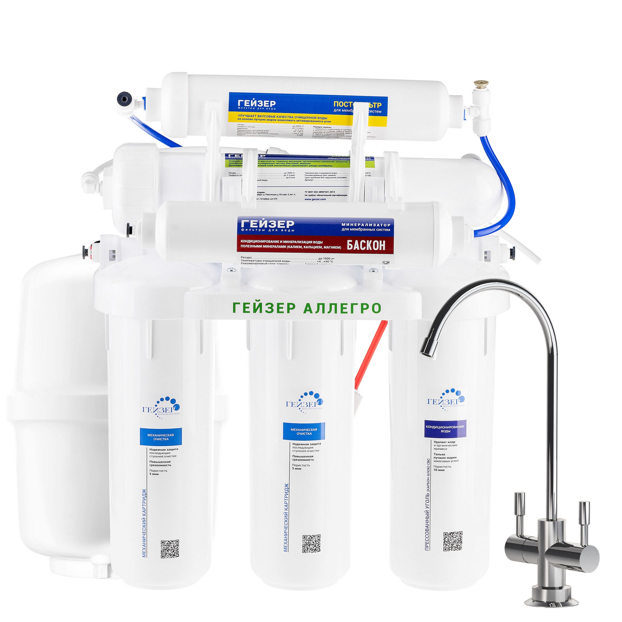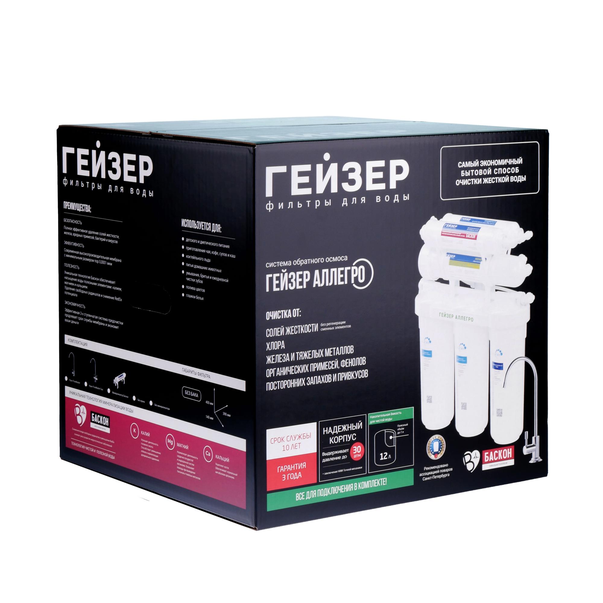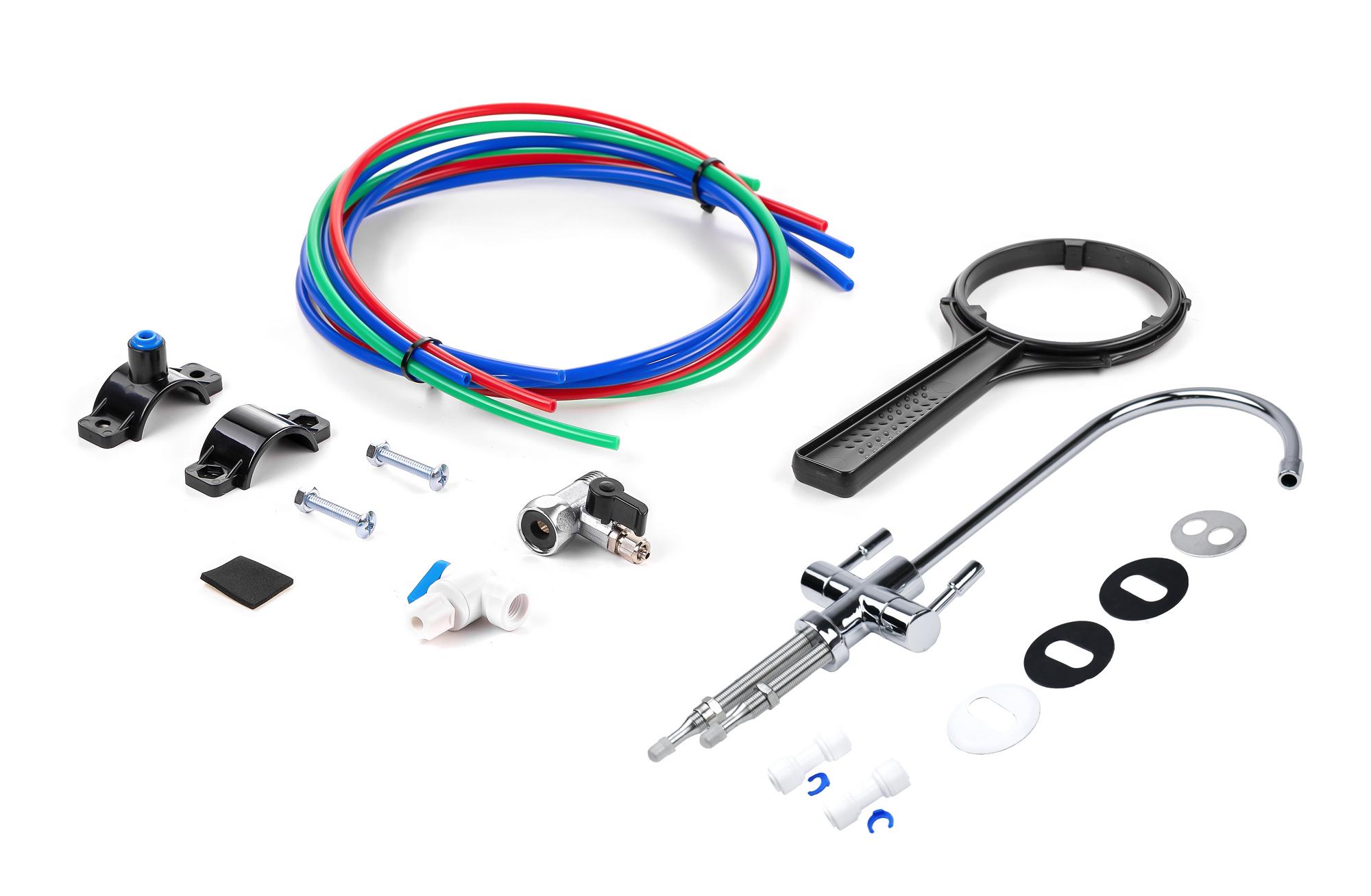 В комплект входит минерализатор «Баскон» для насыщения очищенной воды полезными солями кальция и магния до оптимального уровня жесткости воды — 1–1,5 мг–экв/л. Кран с двумя вентилями обеспечивает подачу воды с минералами (если Вы хотите выпить стакан воды, обогащенной полезными микроэлементами) или без них (для приготовления чая, кофе).