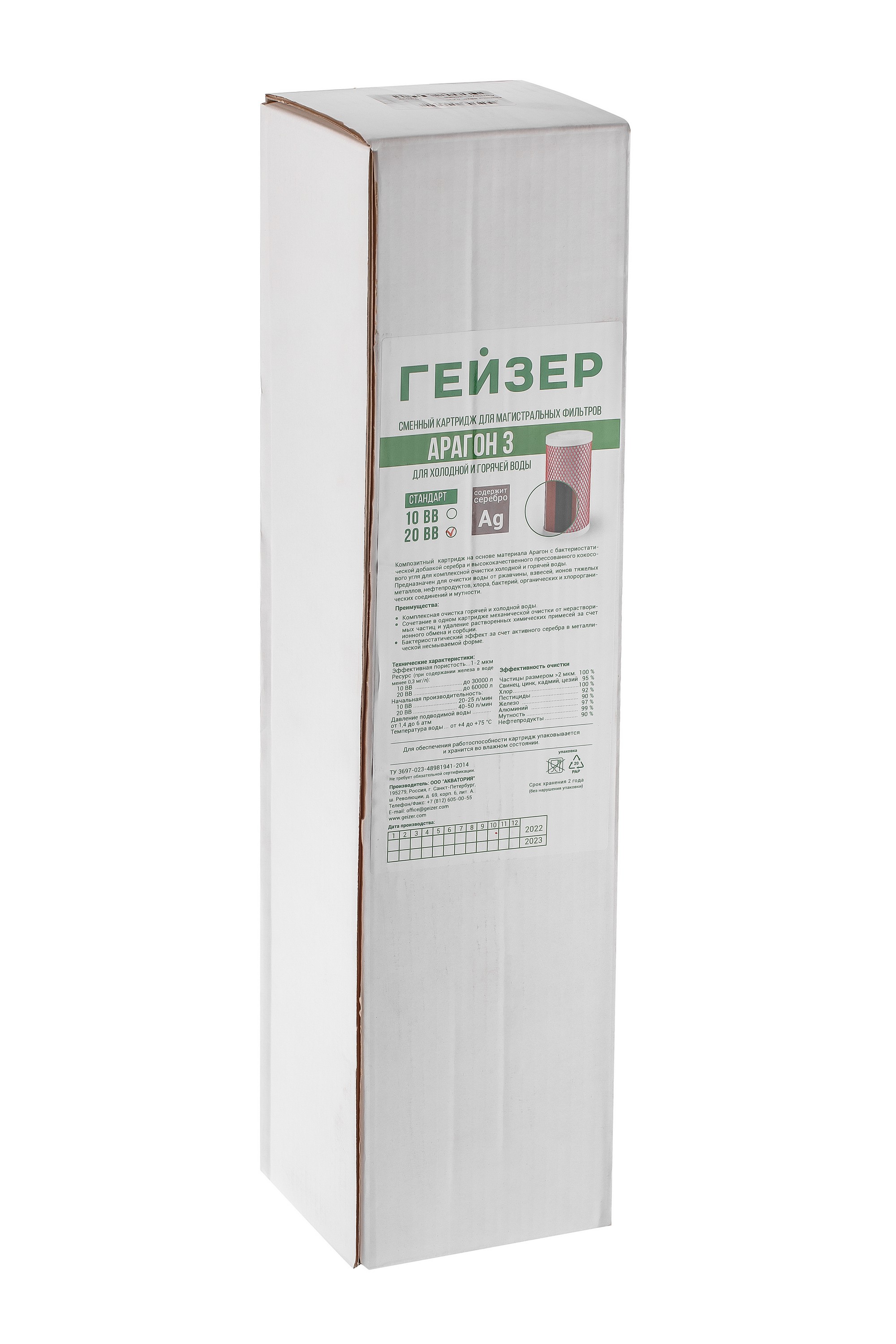 Сменный картридж Гейзер "Арагон-3" 20BB для фильтра Тайфун - это высококачественный картридж, предназначенный для использования в системе "под мойку". Он обеспечивает комплексную очистку воды от механических примесей, ионов железа, тяжелых металлов, нефтепродуктов и хлора.